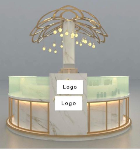 For sale Luxury Beauty & Perfume Kiosk - Elegant Design & Ready to Use A premium, elegant kiosk is available for sale, suitable for displaying beauty products, perfumes, skincare items, or other merchandise. It features a sophisticated circular design with marble finishes and attractive overhead lighting that adds a luxurious touch and draws customer attention. Kiosk Features Luxurious circular design