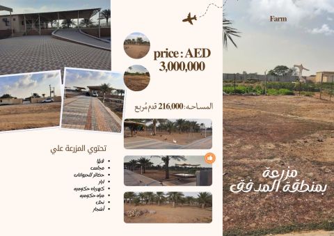 مزرعة للبيع في رأس الخيمة منطقة المدفق اكتشف موقعا استثنائيا قريبا من مطار رأس الخيمة الدولي، مثالي للاستثمار الزراعي والمشاريع السياحية المساحة 253000 قدم مربع - أول قسيمة على الشارع المرافق بئر مياه دائم، أشجار نخيل مثمرة، وسياج محيط التملك متاح للاماراتيين والخليجيين فقط الاستخدامات الممكنة مشروع زراعي تجاري لزراعة المحاصيل والأشجار المثمرة - تربية المواشي والدواجن بفضل المساحة الكبيرة وتوفر السعر