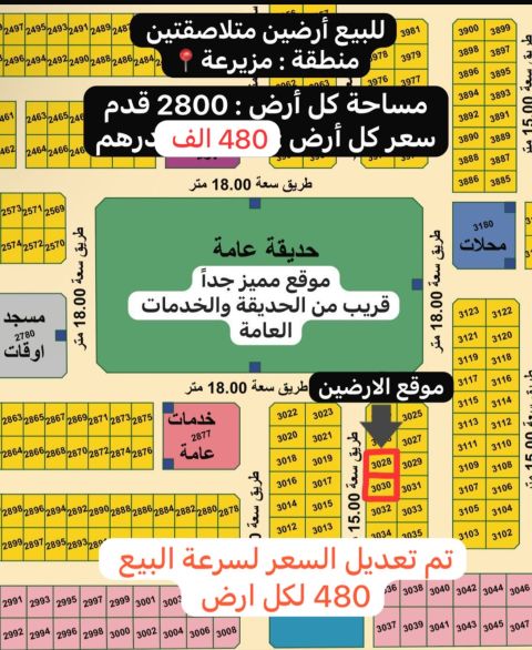 للبيع قطعتين متلاصقات في منطقة مزيرعة موقع ممتاز بالقرب من الحديقة مستقبلا خلف القيادة العامة - دخول وخروج سهل مساحة قطعة 3015 قدم تصريح بناء فيلا سكنيه أرضي وطابقين تملك لجميع الجنسيات العربية السعر قطعة 525000