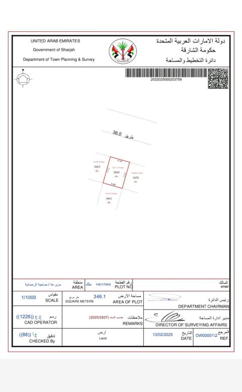 للبيع في منطقة مزيرعة، الشارقة أرض سكنية فيلا أرضي + 2 متكرر مساحة الأرض 3650 قدم مربع شارع رئيسي 36 متر وسكة 6 متر موقع مميز، واجهة 17 متر مربع سعر البيع 670 ألف درهم