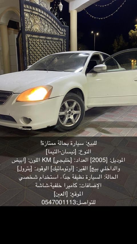 For sale: Excellent condition car. Type: Nissan Altima, Model: 2005. Odometer: 100,000 KM. Color: White with beige interior. Transmission: Automatic. Fuel: Petrol. The car is very clean, personal use. Features: Rear camera, screen. Location: Al Ain. For contact.