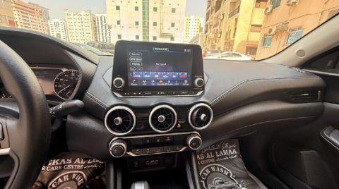 Nissan Sentra SV 2023 model, American specifications, mileage 54,000 km, price 37,000 UAE dirhams. Key features include keyless entry, leather seats, cruise control, traction control system, steering wheel controls, voice commands, power mirrors, touchscreen with rear camera, parking sensors, collision avoidance system. Bank financing available with monthly installment of 660 UAE dirhams with 20% down payment or 825.