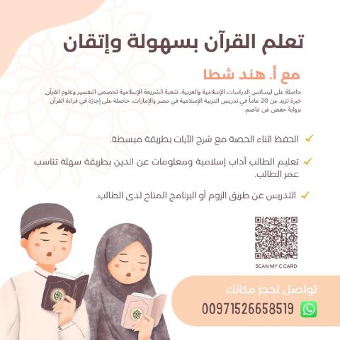 محفظة قرآن الكريم مجازة خبرة عشرون عام اترك طلابي حافظين وفاهمين معاني الأيات مع اعطائهم معلومات مبسطة عن الآداب الاسلامية وتعاليم الدين