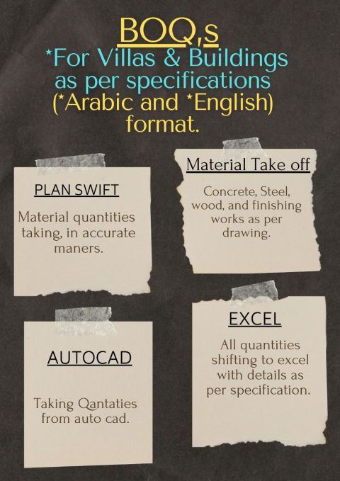 The Bill of Quantities (BOQ) has been meticulously prepared in English and Arabic to define the full scope of works for The Villa and Building. The quantity calculations were performed using industry - standard digital tools, specifically PlanSwift and AutoCAD, and compiled in Microsoft Excel