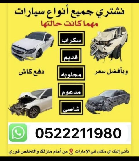 نشتري جميع أنواع السيارات المعطلة والقديمة والحديثة سكراب بدون فحص نشتري سيارات في حوادث، مشاكل شاسيه، مخالفات أو مشاكل أخرى. أرسل صور وتفاصيل عبر واتساب. لدينا مندوبين في جميع أنحاء الامارات. رقم التواصل متوفر