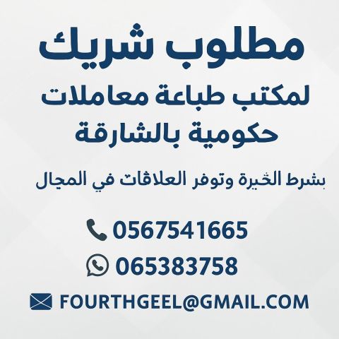 مطلوب شريك لمكتب طباعة معاملات حكومية في الشارقة منطقة النباعة بشرط الخبرة والعلاقات في المجال