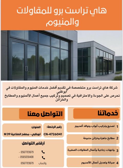 مطلوب للعمل في ورشة صنايعي الألومينيوم ذو خبرة في تركيب وتصنيع (شبابيك - أبواب - مطابخ - واجهات زجاج. يفضل خبرة الدولة لا تقل عن سنتين 2 الورشة بتوفر سكن وإقامة وكل شيء مكان العمل أبوظبي المصفح للتواصل