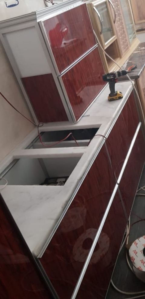 للبيع خزائن مطبخ ألومينيوم مقاس 225 سم تقريبا مع رخامة كما في الصورة بسعر 700 درهم كامل