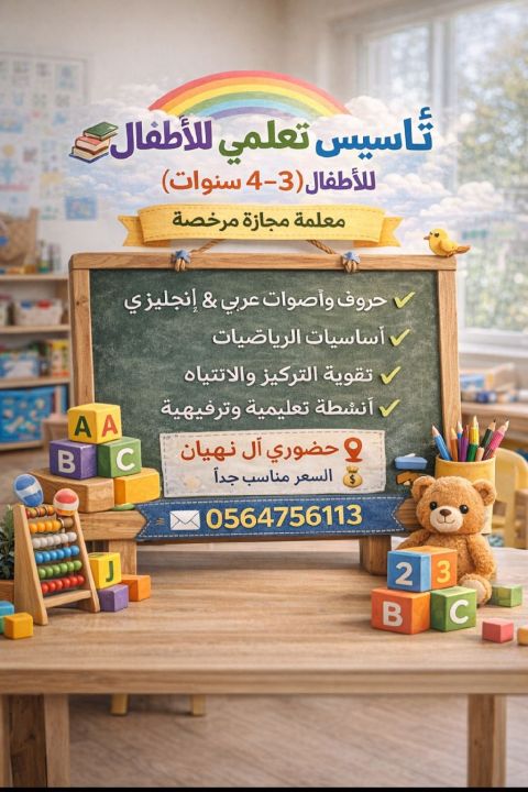 تأسيس تعليمي للاطفال (3 - 4 سنوات) معلمة مجازة مرخصة أقدم برنامج تأسيس ممتع وآمن يشمل حروف وأصوات عربي وانجليزي أساسيات الرياضيات تقوية التركيز والانتباه أنشطة تعليمية وترفيهية حضوري آل نهيان السعر مناسب جدا للتواصل