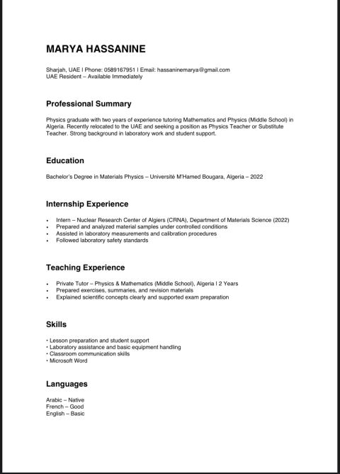 معلمة فيزياء / معلمة بديلة - متاحة فورا حاصلة على بكالوريوس فيزياء مواد خبرة سنتين تدريس رياضيات وفيزياء (مرحلة متوسطة - الجزائر) مقيمة في الشارقة وجاهزة للمباشرة فورا. السيرة الذاتية متوفرة عند الطلب