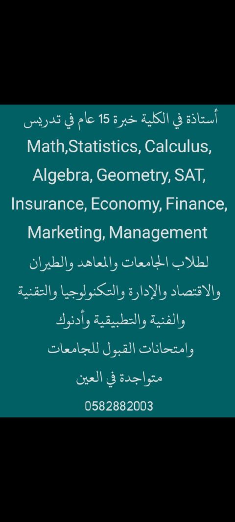 معلمة أستاذة في الكلية خبرة طويلة في تدريس Math، Statistics، Calculus، Algebra، Geometry، SAT، Insurance، Marketing، Economy، Business and Financial Management, لطلاب الجامعات والمعاهد والطيران والاقتصاد والادارة والتكنولوجيا والتقنية والتطبيقية والفنية وأدنوك وامتحانات القبول للجامعات SAT EMSAT متواجدة في العين