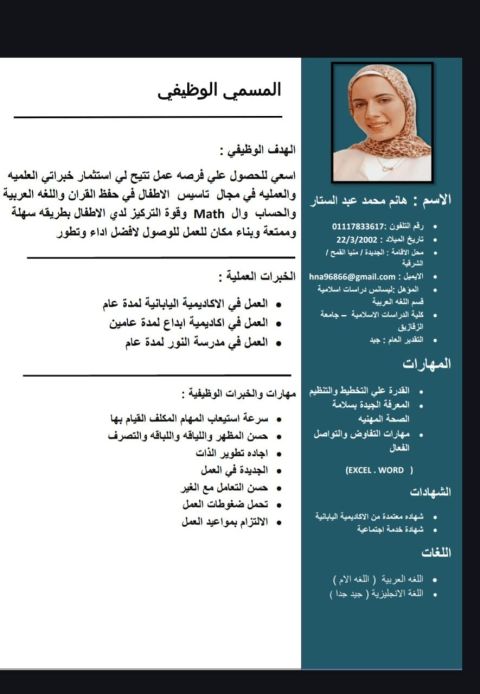I am Ms. Hanem Mohamed Abdel Sattar, 23 years old, a graduate of Islamic Studies, Arabic Language Department. I have four years of experience teaching children the foundational skills of Quran memorization, Arabic, arithmetic, and math. I am a foundational teacher for all grades and have experience in teaching the Quran to children of all ages, focusing on improving their concentration in an easy