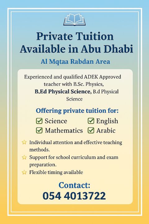 Special Individual tuition is available for students KG to grade 10, please call ADEK Approved Lady Teacher