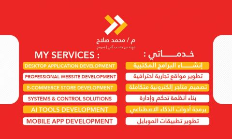 هل تبحث عن تطوير وتنظيم عمل شركتك. نحن نعمل على تصميم برامج للشركات على حسب الطلب، برامج محاسبية، نقاط البيع، كاشير، تصميم مواقع ومتاجر الكترونية وادارتها - تسويق الكتروني مواقع التواصل الاجتماعي. خدمات تصوير اعلاني فوتوغرافي منتجات أو فيديو انتاج فيديوهات اعلانية، أنظمة لادارة نشاطك