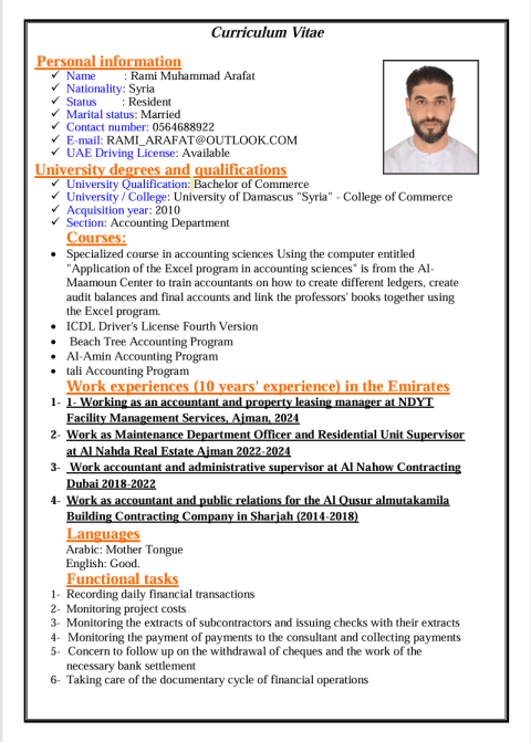 شاب سوري يبحث عن عمل خبرة ممتازة وقوية في العلاقات العامة، لمدة 10 سنوات ومتابعة جميع المعاملات الحكومية الخاصة بالشركات ومعاملات الخاصة بالموظفين والطباعة علي برامج الجوازات والعمل والعمال والضمان الصحي والبلدة وبرنامج تم وكاتب العدل والنيابة وخبرة في العمل في المدارس الخاصة، ومتابعة معاملاتها وتقديمها وطباعة معاملات دائرة التنمية الاقتصادية والمحاكم وادارة المرور والتراخيص وخبرة ممتازة في شؤون الموظفين