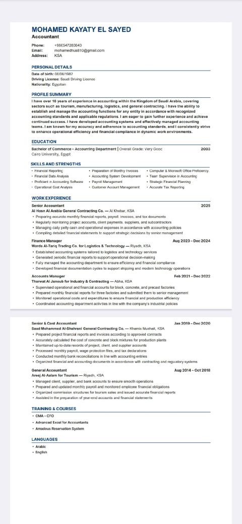 محاسب مصري خبرة في السوق السعودي لأكثر من 10 سنوات في إدارة وتأسيس نظام محاسبي وشجرة الحسابات - متابعة حسابات العملاء والموردين ومطابقة البنوك - الرواتب وحماية الأجور - اعداد القوائم الماليه ومتابعة عمل الميزانية السنويه واعداد الموازنات الشهرية والتقديريه - اجادة العمل علي البرامج المحاسبية والمنصات الحكومية - خبرات عملية كمدير حسابات وإدارة قسم الماليه - خبرات عملية في المقاولات والمصانع والسياحة