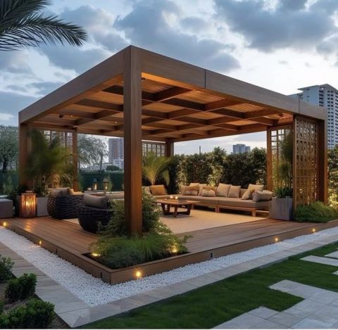 تنسيق الحدائق الأكواخ والمظلات الخشبية تعد الأكواخ والمظلات الخشبية العنصر الأبرز في تصميم الحدائق العصرية، حيث تدمج بين الفخامة والراحة. يوفر الكوخ الخشبي مساحة اضافية هادئة (للاسترخاء أو العمل) بينما تمنحك المظلات (البرجولات) جلسات خارجية محمية ومميزة يركز تخصص تنسيق الحدائق على دمج هذه العناصر مع الطبيعة عبر توزيع المساحات استغلال الزوايا لوضع الكوخ أو المظلة بشكل انسيابي. التشجير زراعة