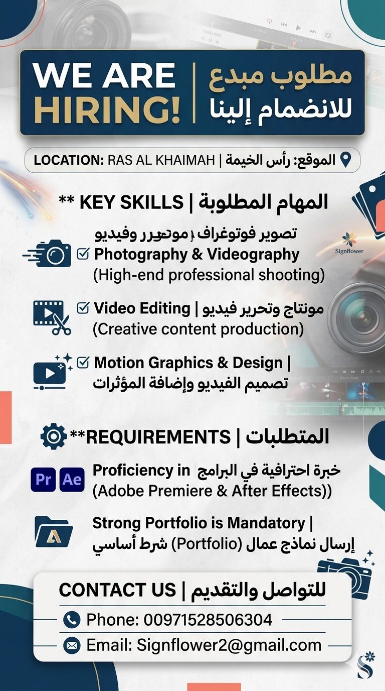 مطلوب مصور وصانع محتوى للعمل في شركة مرموقة في رأس الخيمة منطقة القصيدات المهام والخبرات Photography & Videography تصوير فوتوغراف وفيديو باحترافية عالية. Video Editing مونتاج وتحرير فيديو بالمسة ابداعية. Motion Graphics القدرة على تصميم الفيديو واضافة المؤثرات. خبرة احترافية في (Adobe Premiere & After Effects) ارسال السيرة وبغض الأعمال واتساب أو ايميل