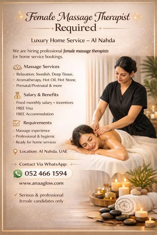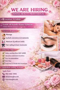 Female Beauty Technician Required - Home Services We are hiring a Female All - Rounder Beauty Professional for home beauty services in Dubai. Massage Eyelashes Nails Hair Styling Salary from AED3000 + Commission Free Accommodation & Visa Immediate Joining Location Al Nahda sahara plaza Contact