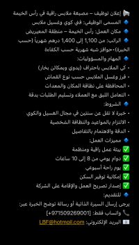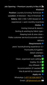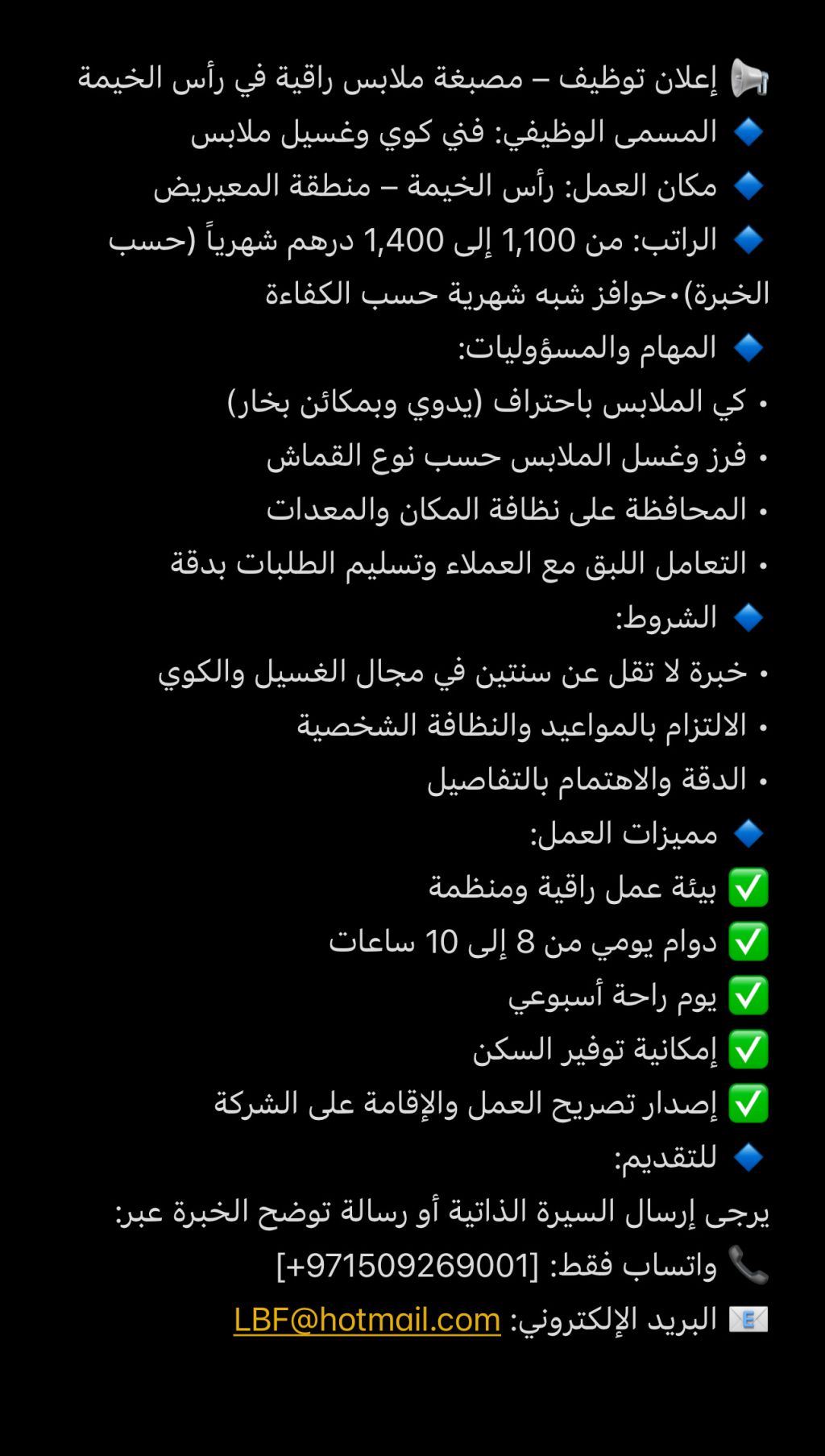 اعلان توظيف - مصبغة ملابس راقية في رأس الخيمة المسمى الوظيفي فني كوي وغسيل ملابس مكان العمل رأس الخيمة - منطقة المعيريض