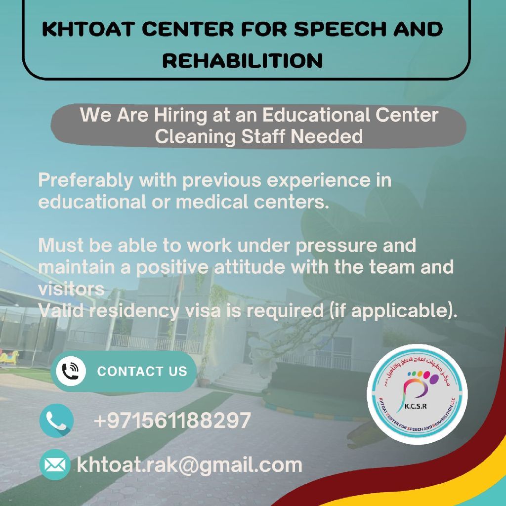 Steps Center for Speech Therapy and Rehabilitation is looking for a full time cleaner to work in Ras Al-Khaimah, United Arab Emirates, specifically in the Khuzam area. For contact, please send your CV to the numbers shown
