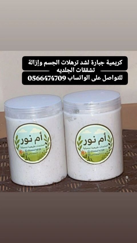 كريمية جبارة لشد ترهلات البطن والجسم وازالة تشققات جلدية الذي تظهر مع الحمل والولادة وخسارة الوزن وتعمل على مرونة البشرة وتشيل خطوط بيضاء وسوداء بالجسم وشد الجلد المتر هل منه البطن والافخاد وذراعين نتيجة في مدة زمنية قصيرة مالها أي أضرار جانبية طبيعية 100 خالية من أي مواد كيميائية (ملاحظة) صالحة للرجال والنساء للتواصل