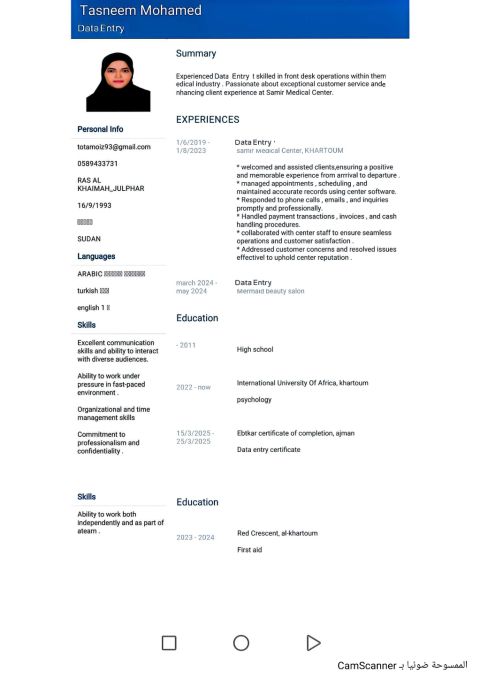 أنا تسنيم علي سودانية ابحث عن وظيفة ادخال بيانات لدي اقامة سارية، أتحمل ضغط العمل، جادة، للتواصل