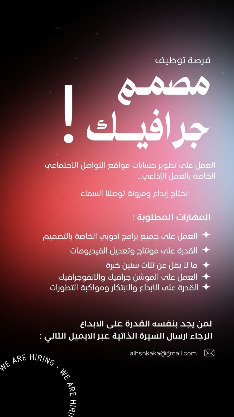 نبحث عن شخص مبدع ومبتكر للعمل على تطوير حسابات مواقع التواصل الاجتماعي الخاصة بالعمل الاذاعي، يمتلك الشغف والمرونة لصناعة محتوى يصل الى السماء. المهام الوظيفية العمل على تطوير المحتوى البصري لمنصات التواصل الاجتماعي الخاصة بالاذاعة، بما يشمل التصاميم والمنشورات والفيديوهات الابداعية. المهارات المطلوبة اجادة العمل على جميع برامج أدوبي الخاصة بالتصميم القدرة على المونتاج وتعديل الفيديوهات خبرة لا تقل