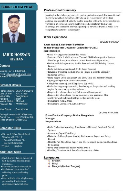 I have 4 + years experience in typing center also I have 3 + years experience in driving (light vehicle 3 - auto) and now I am in cancel visa