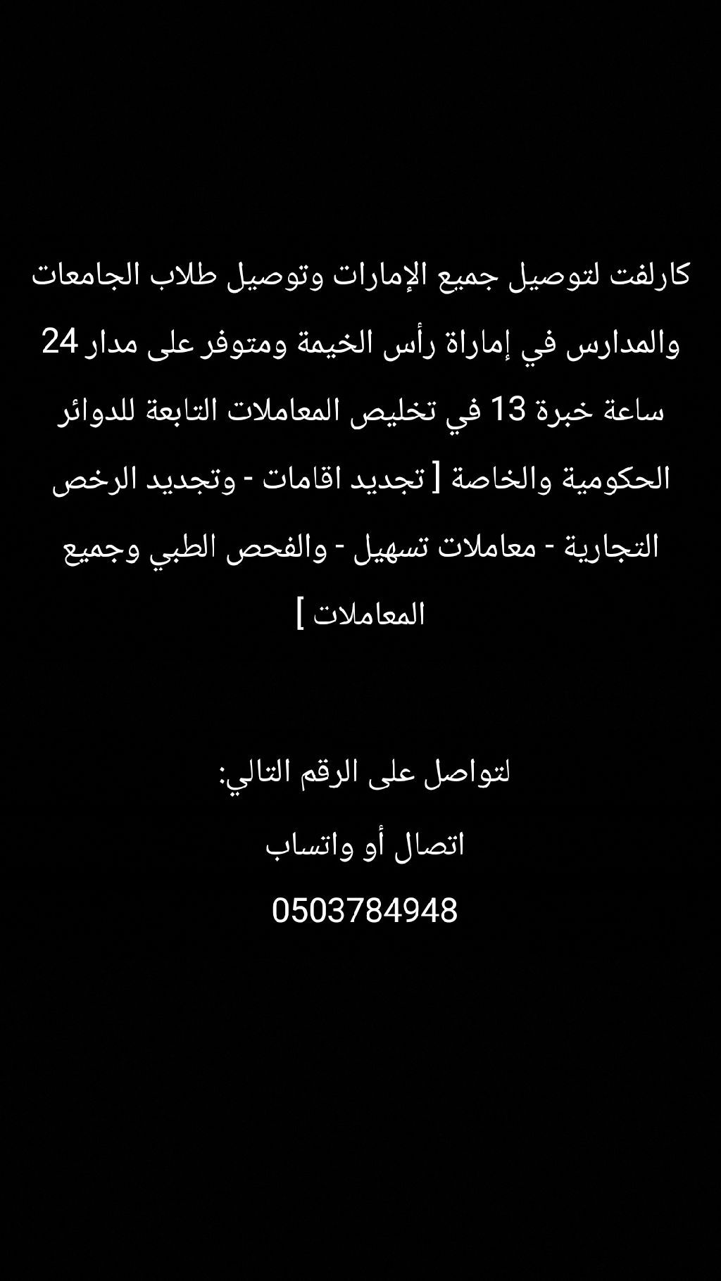 متوفر كارلفت لجميع الامارات وتوصيل طلاب الجامعات والمدارس في أماراة رأس الخيمة ومتوفر على مدار 24 ساعة خبرة مدة 13 في مجال تخليص جميع المعاملات التابعة للدوائر الحكومية والخاصة تجديد اقامات وتجديد رخص تجارية معاملات تسهيل والفحص الطبي والهوية الاماراتية وجميع المعاملات الخاصة في إمارة رأس الخيمة