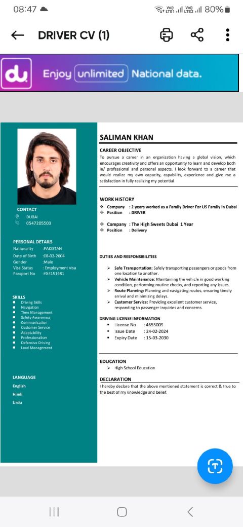 My name is Salman and I have been driving in Dubai for 15 years. I have 10 years of local family driver experience. I speak Arabic and English. Visa status cancel now I free location in Dubai