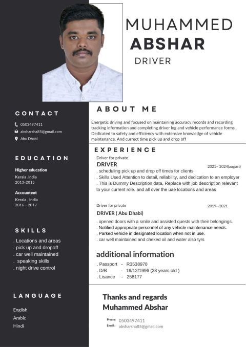 Am Muhammed abshar from India (Kerala) now am looking for a driver job I have manual license and 7 years of experience in Abu Dhabi and Dubai (private driver) contact me