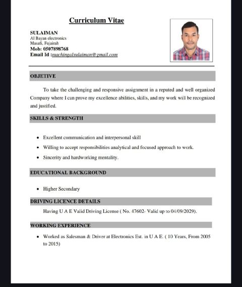 Sahin Islam I am Sulaiman From India I am driver Have experience 21 years UAE. my own Visa. I am a good experts salesman. Im good experience public relation. any driving work