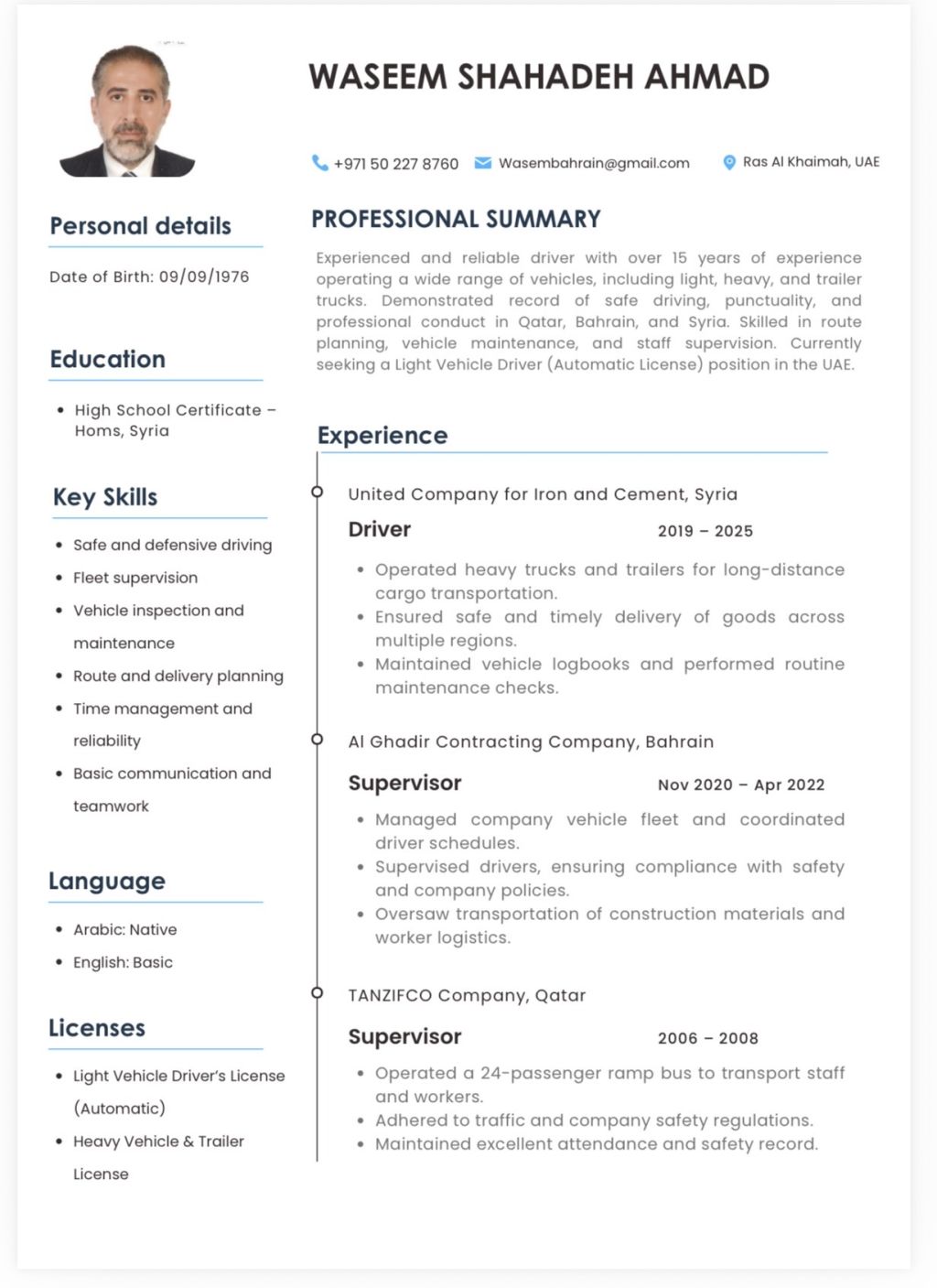 ابحث عن فرصة عمل سائق خفيف خبرة بجميع أنواع السيارات في أي مجال العمل مقيم في رأس الخيمة مستعد للانتقال أي انارة شغال كنت في قطر توصيل عمال والبحرين سائق نقل ثقيل بس الآن معي ليسن امارات خفيف حتى اسوي ثقيل
