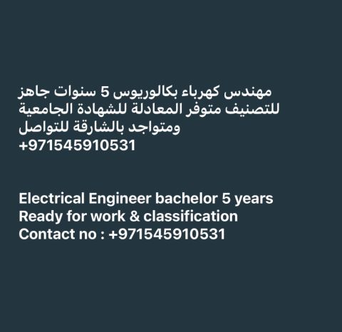 مهندس كهرباء حاصل على درجة البكالوريوس وجاهز للتصنيف ومتوفر المعادلة للشهادة الجامعية ومتواجد في الشارقة. للتواصل