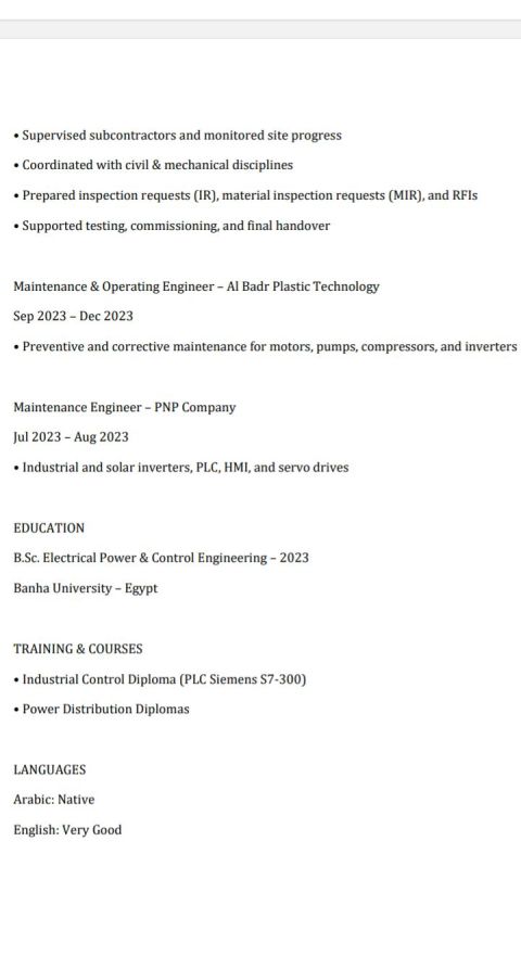 مهندس كهرباء دفعة 2022 لدى خبرة عامين في مجال المقاولات في الامارات ولدي رخصة قيادة اماراتية