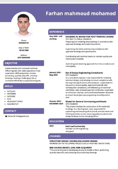 مهندس مدني دفعة 2022 خبرة 9 شهور في دبي وعندي خبرة في أعمال التنفيذ والتشطيبات وادارة أعمال الموقع بالاضافة الى استخدام البرامج الهندسية سيف والايتابس
