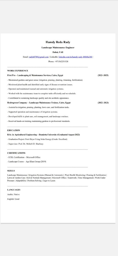 مهندس حمدي رضا لدي خبرة سنتين في صيانة اللاند سكيب وتنسيق حدائق
