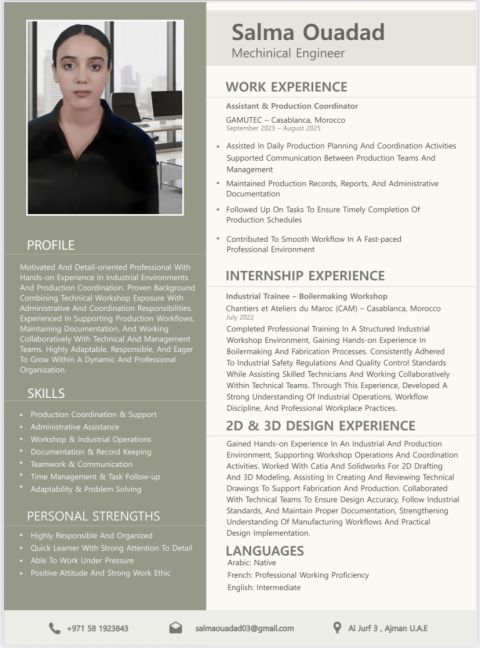 لدي شهادة تقني عالي في الهندسة الميكانيكية تخصص القوالب ولدي خبرة في تنسيق الأعمال وقيادة الفريق في شركة لتصنيع المادة الأولى pvc وأيضا في تصميمي القطع الميكانيكية في catia and solidworks أجيد العمل أيضا في microsft office وأخيرا لدي خبرة في خدمة الزبائن ومساعدة مدير تقني