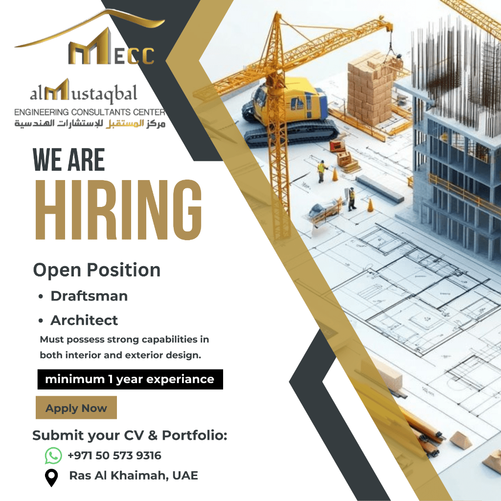 We Are Hiring MECC - Al Mustaqbal Engineering Consultants Center MECC - Al Mustaqbal Engineering Consultants Center is expanding its team and is currently looking for talented professionals to join us in Ras Al-Khaimah, UAE. Al Qusaidat, Ras Al-Khaimah - UAE