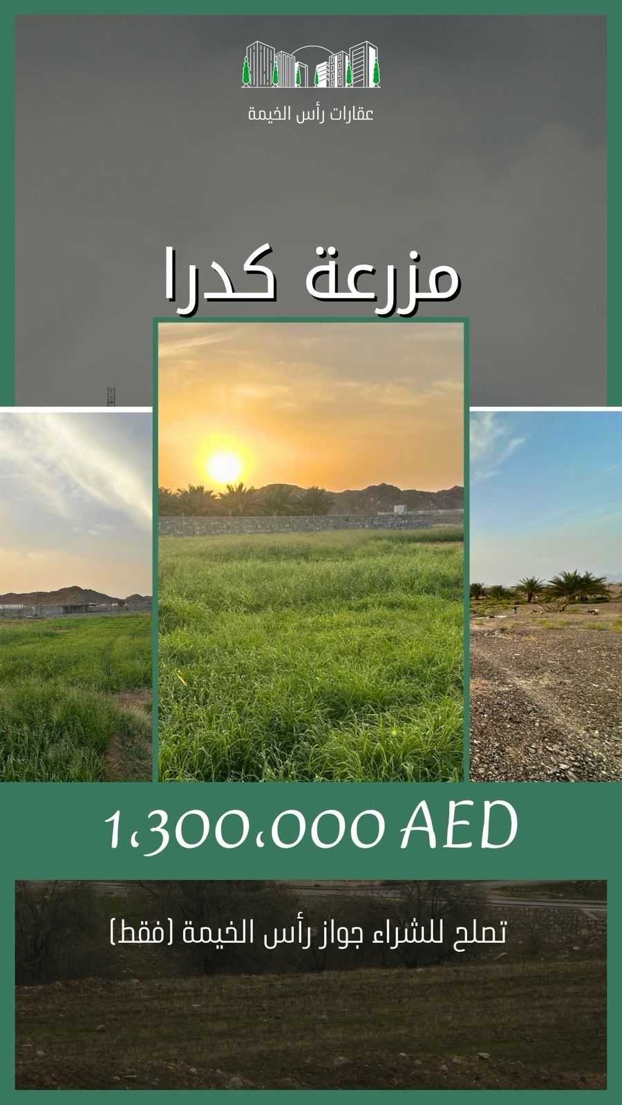 مزرعة بكدرا - اطلالة مباشرة على الوادي مساحة 260 ألف قدم (510*510) موقع منفرد وهادئ بالقرب من الشارع العام. المزايا كهرباء ضغط عالي (98KV) تصلح لمشاريع صناعية أو سياحية. تضم 2 بئر،100 نخلة، 50 رأس حلال، سكن عمال (3 عمال) وشبكة ري متكاملة. السعر 1300000 درهم (سعر نهائي) ملاحظة البيع لحاملي جواز رأس الخيمة فقط. استثمار زراعي وصناعي متكامل