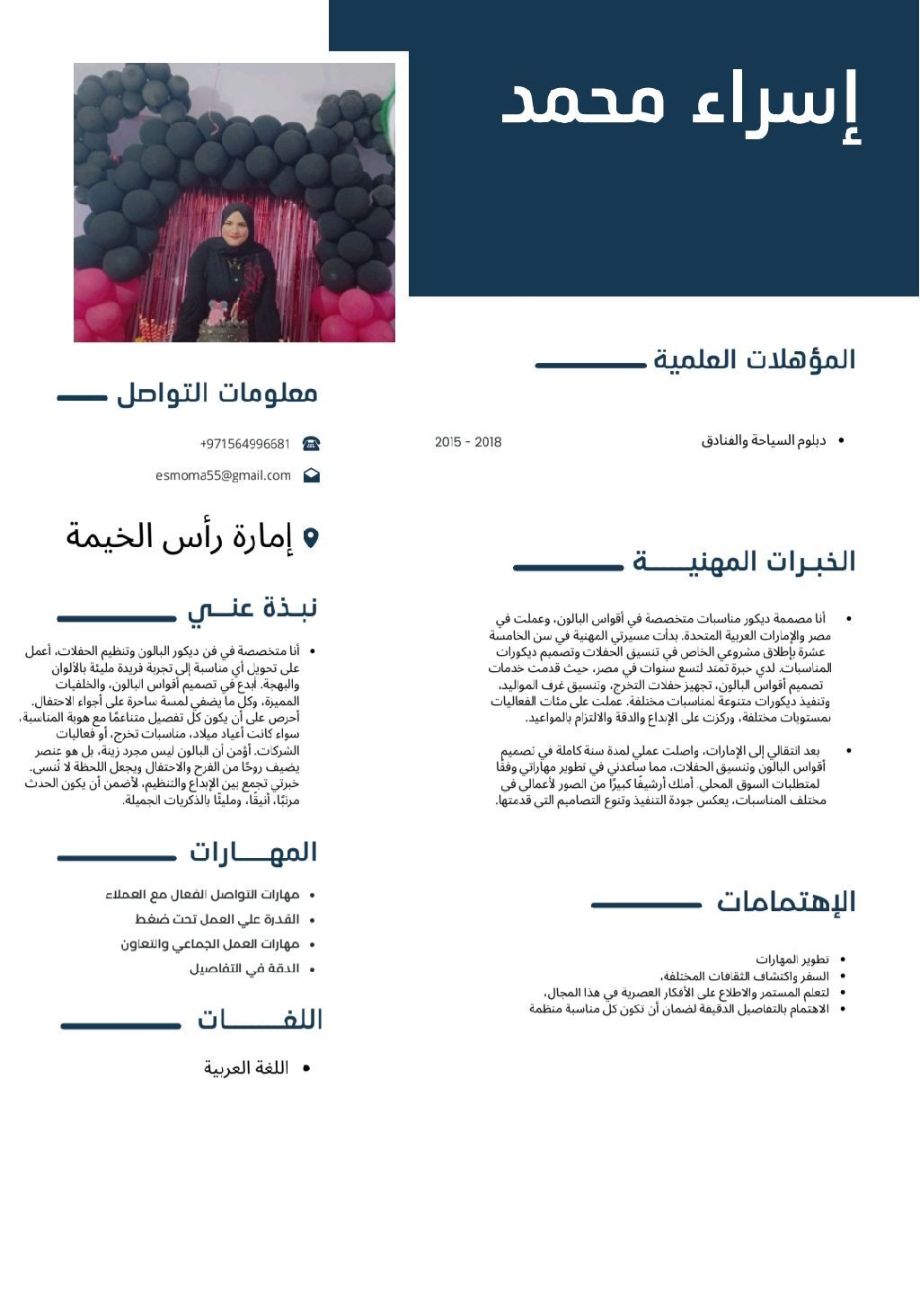 الاسم اسراء محمد السن 25 سنة الجنسية مصرية ابحث عن عمل بمجال ديكور الحفلات بالأخص أقواس الباللون لدي خبرة 9 سنوات في مصر مشروعي الخاص وسنة في الامارات