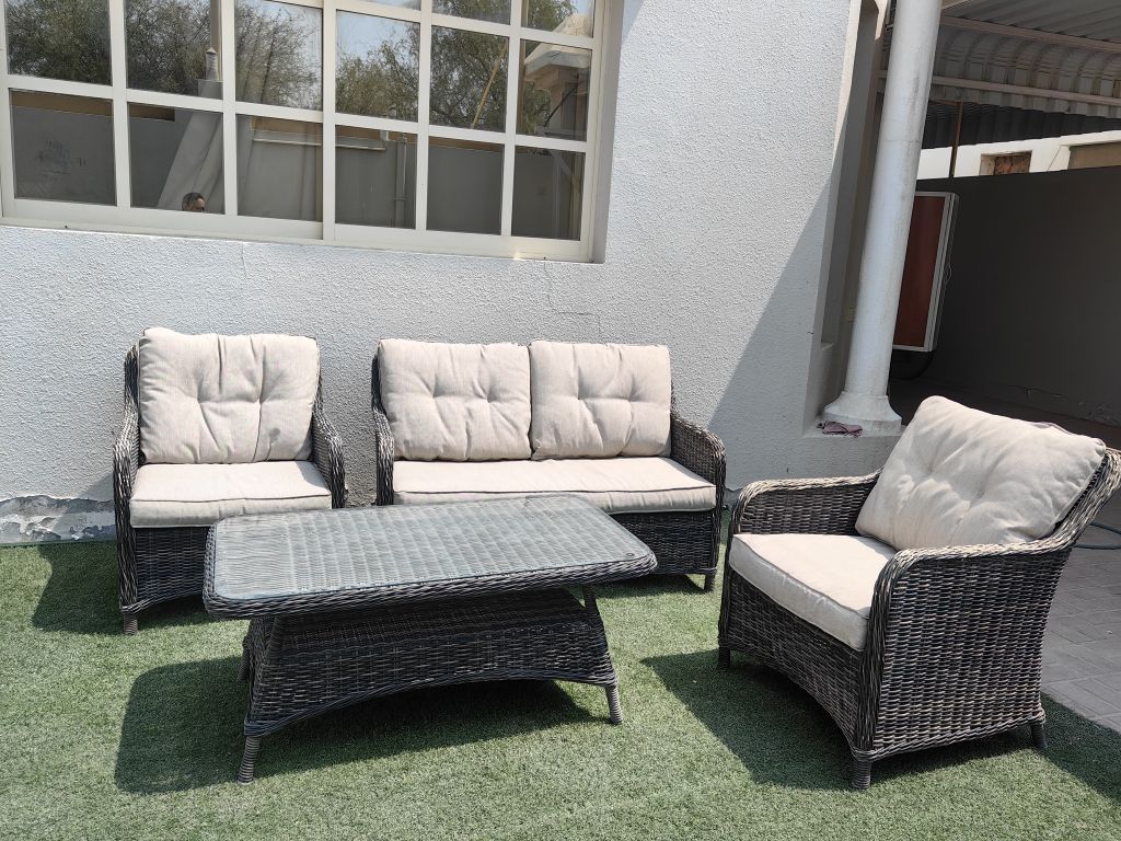 جلسة outdoor مكونة من 2 كرسي وكنبة قابلة وطاولة. بسعر 200 درهم