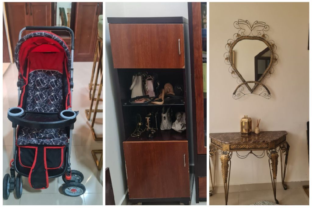كونسول أستيل مع المراية ب 100 درهم. استاند خشبي ب 60 درهم. عربة اطفال ب 60 درهم