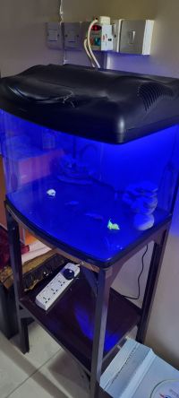 Large ornamental fish tank and accessories for sale, used but in excellent condition, including a stand. Price AED300