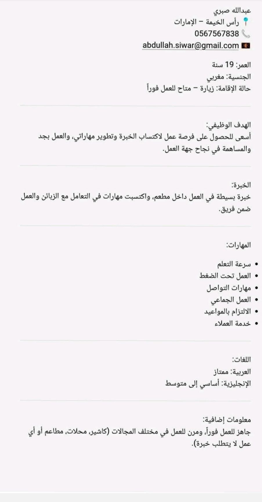 عبدالله صبري رأس الخيمة الامارات 0567567838 العمر 19 سنة الجنسية مغربي حالة الإقامة زيارة - متاح للعمل فورا - الهدف الوظيفي شاب طموح وأسعى للحصول على فرصة عمل لاكتساب الخبرة وتطوير مهاراتي العملية، والمساهمة بفعالية في نجاح جهة العمل من خلال الالتزام والعمل الجاد. الخبرة العملية عامل مطعم اكتساب خبرة في خدمة العملاء والتعامل مع الزبائن باحترافية العمل ضمن فريق المساعدة