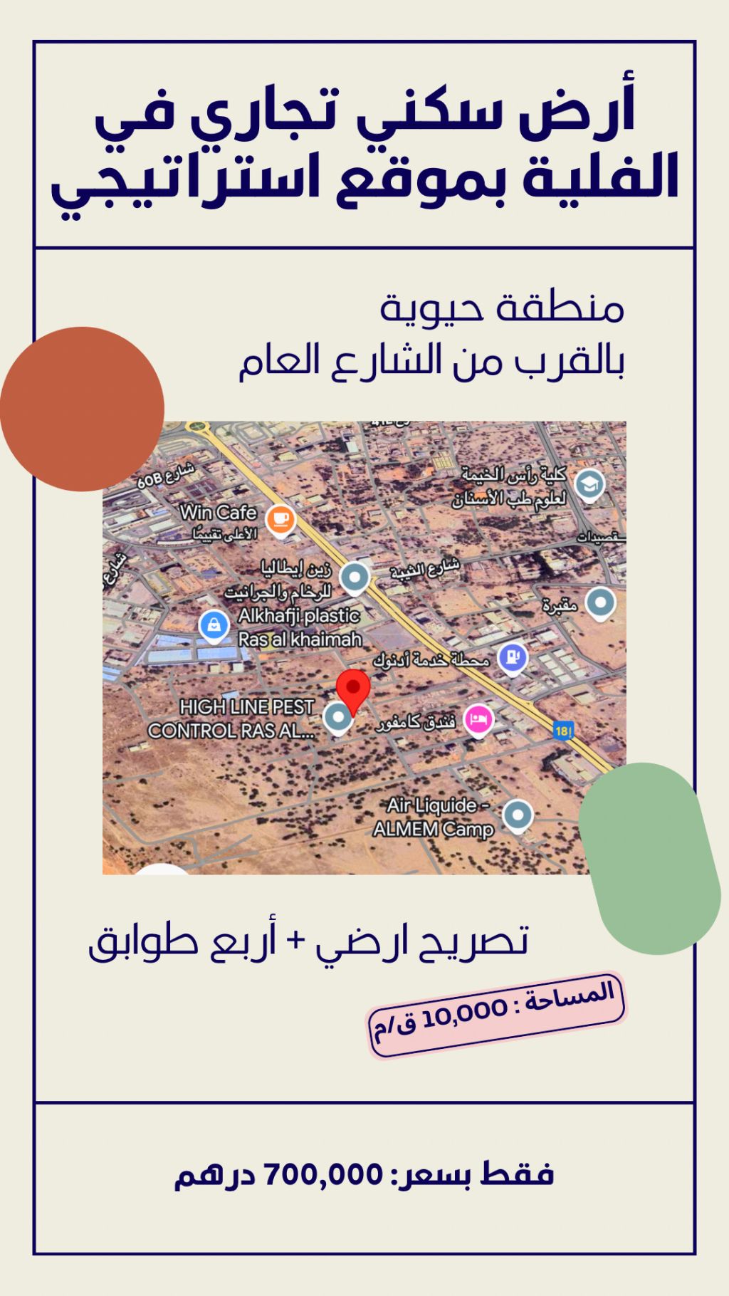 أرض سكني تجاري بمنطقة الفلية بالقرب من الشارع العام وفندق كام فور وبجوار البنايات المساحة 10000 قدم مربع تصريح أرضي + أربع طوابق الموقع استراتيجي فقط بسعر 700000 درهم