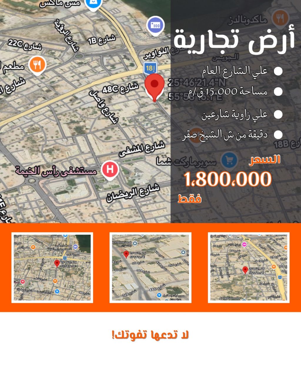 استثمر الآن في واحدة من أميز الأراضي التجارية في منطقة القصيدات مساحة واسعة 15000 قدم مربع. زاوية على شارعين لسهولة التصميم والمداخل. موقع حيوي جدا على الشارع العام. قريبة جدا من كافة الخدمات وشارع الشيخ صقر. المطلوب 1800000 د إ