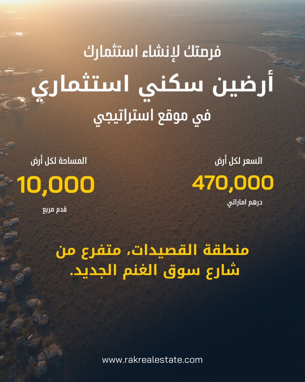 أرضين متلاصقتين، سكني استثماري بموقع استراتيجي في منطقة القصيدات متفرع من شارع سوق الغنم الجديد. المساحة لكل أرض 10000 قدم مربع السعر لكل أرض 470000 د إ