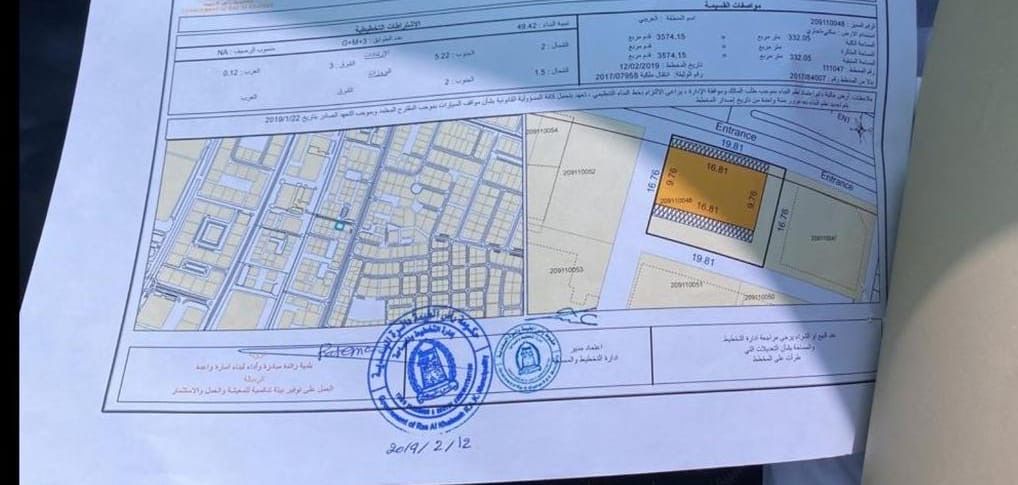 للبيع أرض سكني تجاري في منطقة العريبي خلف مطعم السندباد في إمارة رأس الخيمة مساحة 3600 قدم مطلوب 550 ألف